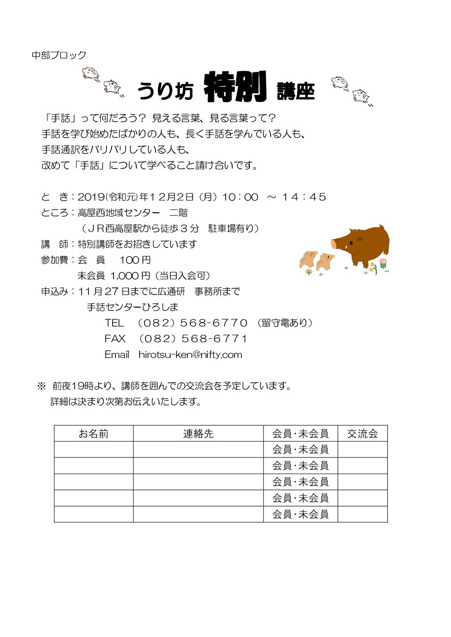 投稿日時: 2019/11/10 投稿者: admin 12月2日(月)うり坊特別講座 日時:2019年12月2日(月)10:00~14:45 会場:東広島市高屋西地域センター 参加費:会員 100円、未会員 1,000円 お知らせ中部ブロック うり坊特別講座 20191202